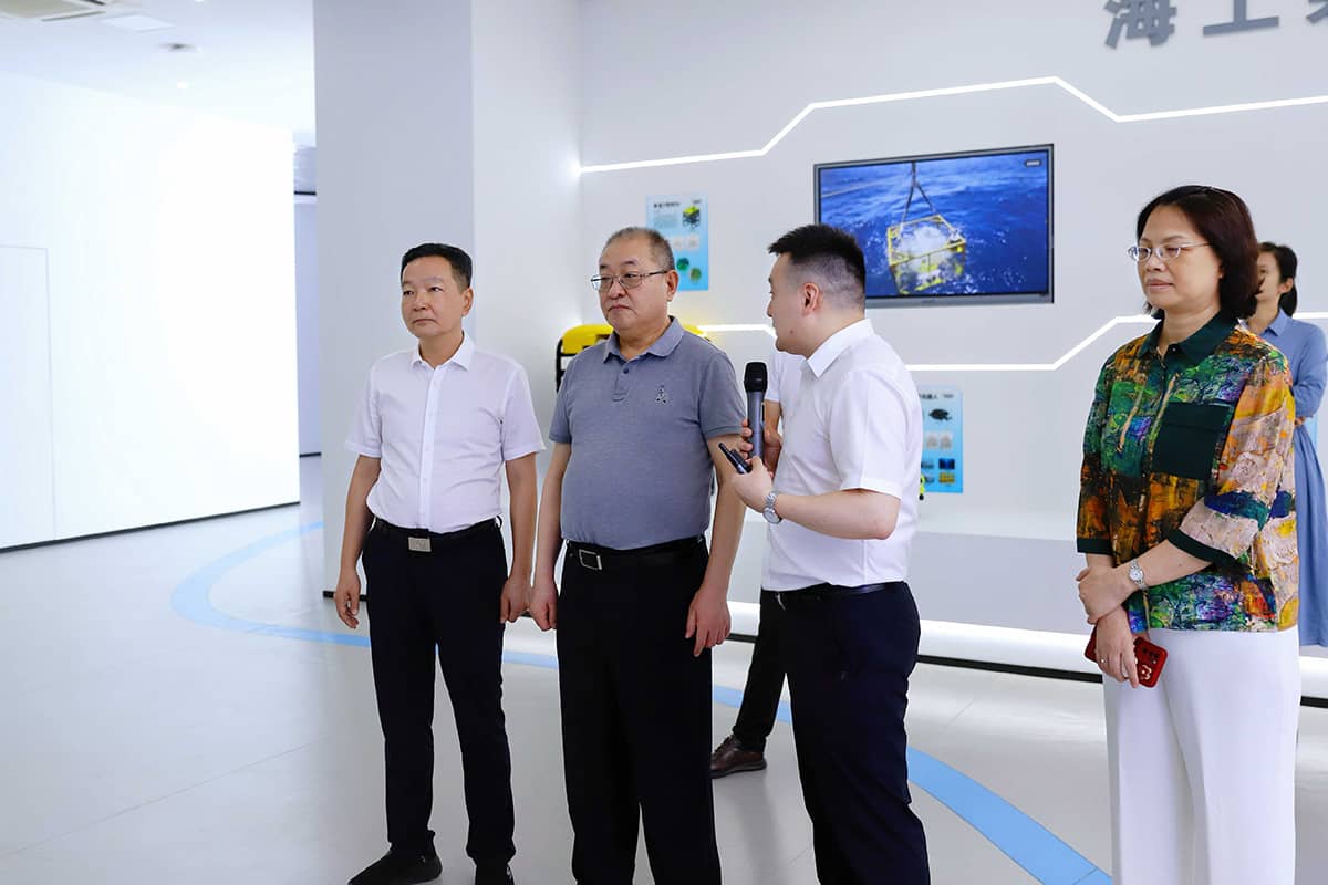 在調(diào)研過程中,吳海騰向各位領(lǐng)導(dǎo)闡述了實(shí)驗室的發(fā)展情況,并展示了實(shí)驗室各項成果,包括“申龍?zhí)枴彼聶C(jī)器人、三維聲吶、水下安防平臺等,并詳細(xì)匯報了人工智能產(chǎn)品在海洋測繪、海底資產(chǎn)數(shù)據(jù)發(fā)掘、低空經(jīng)濟(jì)發(fā)展等領(lǐng)域的創(chuàng)新技術(shù)和應(yīng)用。